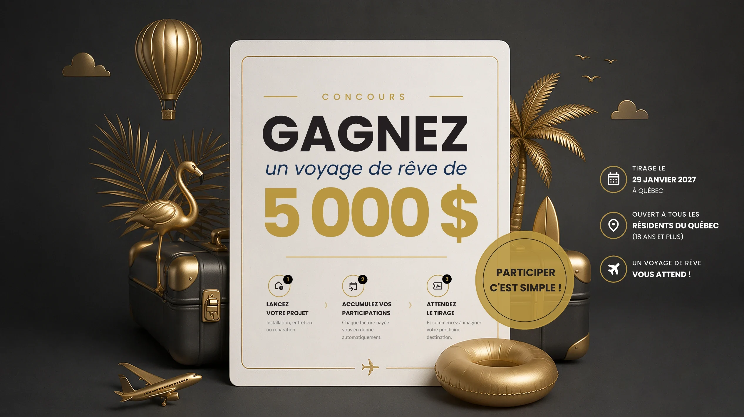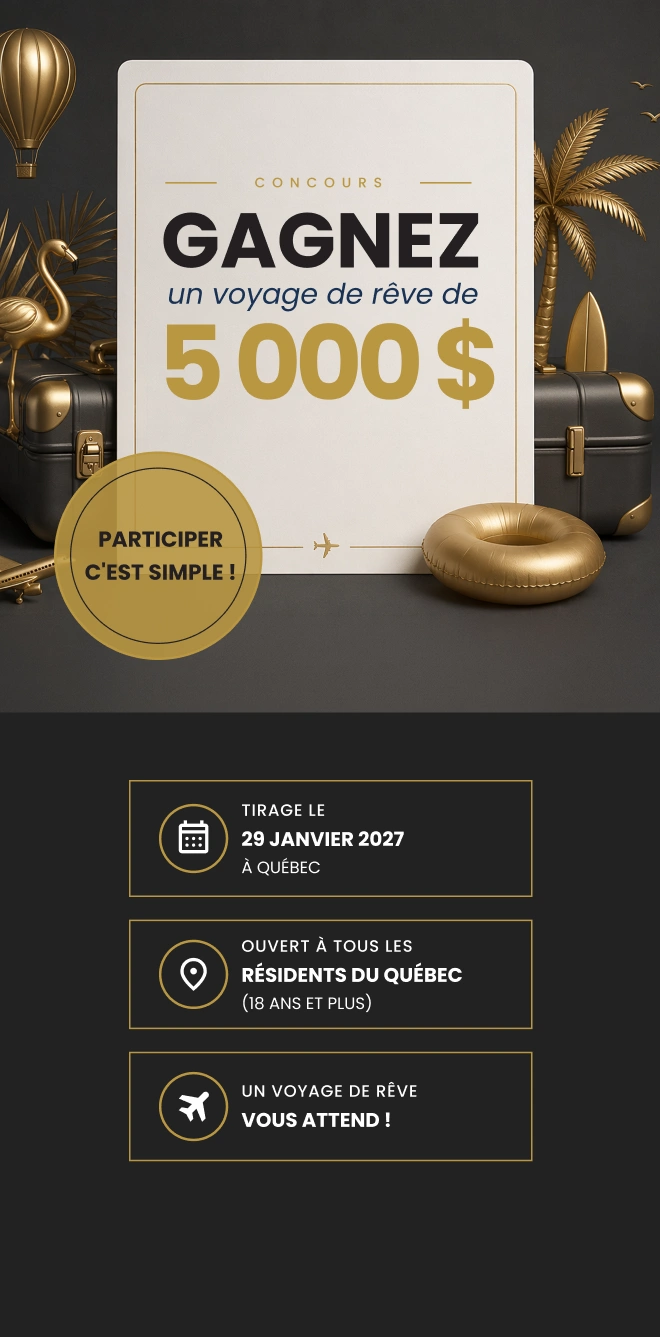 Le concours permet de courir la chance de gagner un crédit-voyage de 5 000 $, applicable selon les conditions du fournisseur.